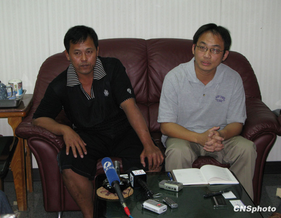 圖為3月6日“穩(wěn)發(fā)161號”船長顏勝男(左)、穩(wěn)發(fā)漁業(yè)公司經(jīng)理劉銘復(fù)(右)在高雄接受大陸記者采訪,他們感謝大陸船東協(xié)會提供及時幫助、海軍提供柴油、伙食和護航。 中新社發(fā) 耿軍 攝