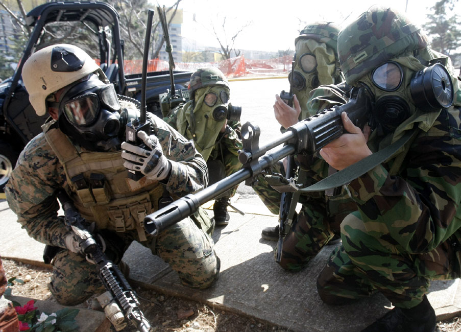 3月11日,在韓國鎮(zhèn)海海軍基地,韓美兩國的海軍陸戰(zhàn)隊舉行了聯(lián)合反恐軍事演習。