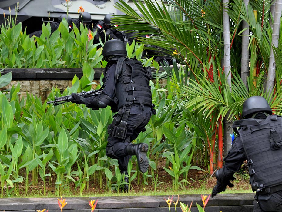 3月13日,印尼警方在首都雅加達(dá)的證券交易所舉行了一場反恐演習(xí),為本月底即將到訪印尼的美國總統(tǒng)奧巴馬創(chuàng)造安全的環(huán)境。圖片來源:中國新聞網(wǎng)