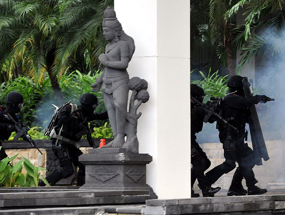 3月13日,印尼警方在首都雅加達(dá)的證券交易所舉行了一場(chǎng)反恐演習(xí),為本月底即將到訪印尼的美國(guó)總統(tǒng)奧巴馬創(chuàng)造安全的環(huán)境。圖片來(lái)源:中國(guó)新聞網(wǎng)