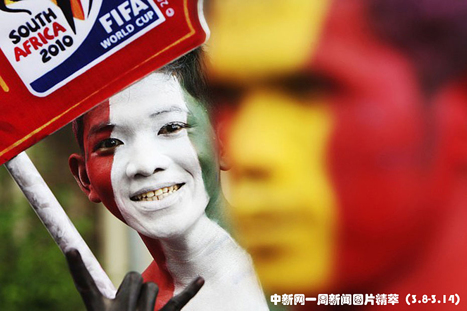 周一在印尼雅加達(dá)舉行的FIFA世界杯足球賽宣傳活動(dòng)上,人們?cè)谏砩贤可狭藚①悋?guó)家的國(guó)旗。圖片來(lái)源:中國(guó)新聞網(wǎng)