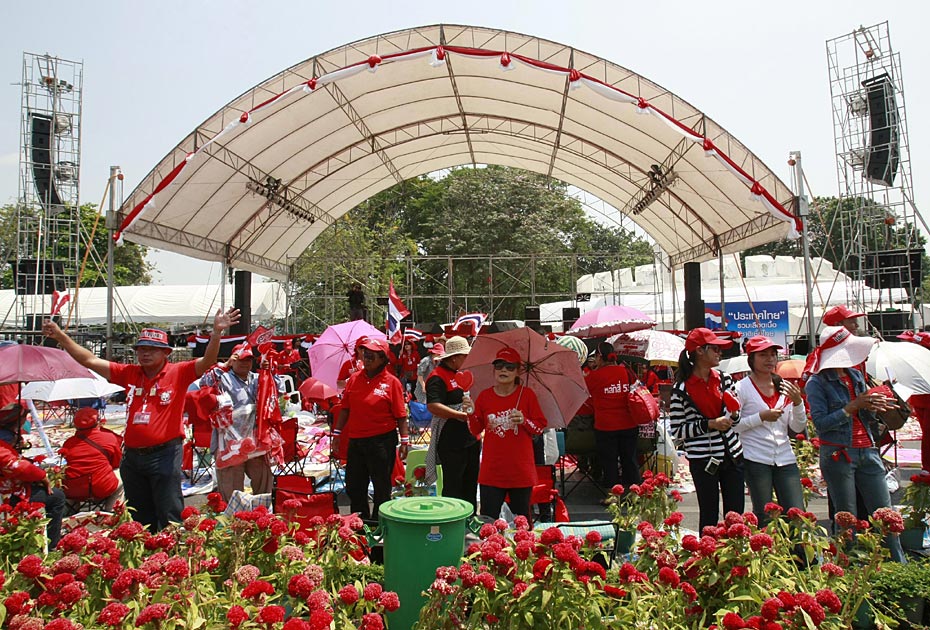 3月13日起,泰國“紅衫軍”陸續(xù)從泰國北部、東北部等外府進(jìn)入曼谷市,在集會主會場搭設(shè)演講舞臺和帳篷,拉開大規(guī)模示威序幕。圖片來源:中國新聞網(wǎng)