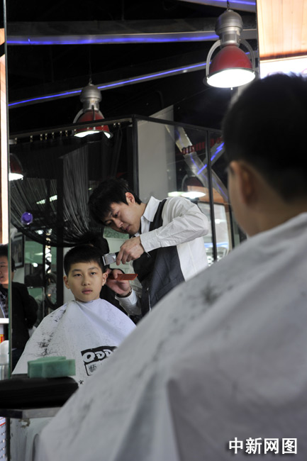 3月17日,北京,一個(gè)小朋友在一家美發(fā)店理發(fā)。中新網(wǎng)記者 金碩 攝