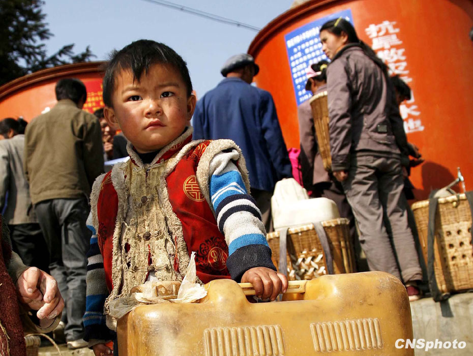 3月12日,在云南省富源縣小羊場(chǎng)村口等待取水的兒童。中新社發(fā) 劉冉陽 攝