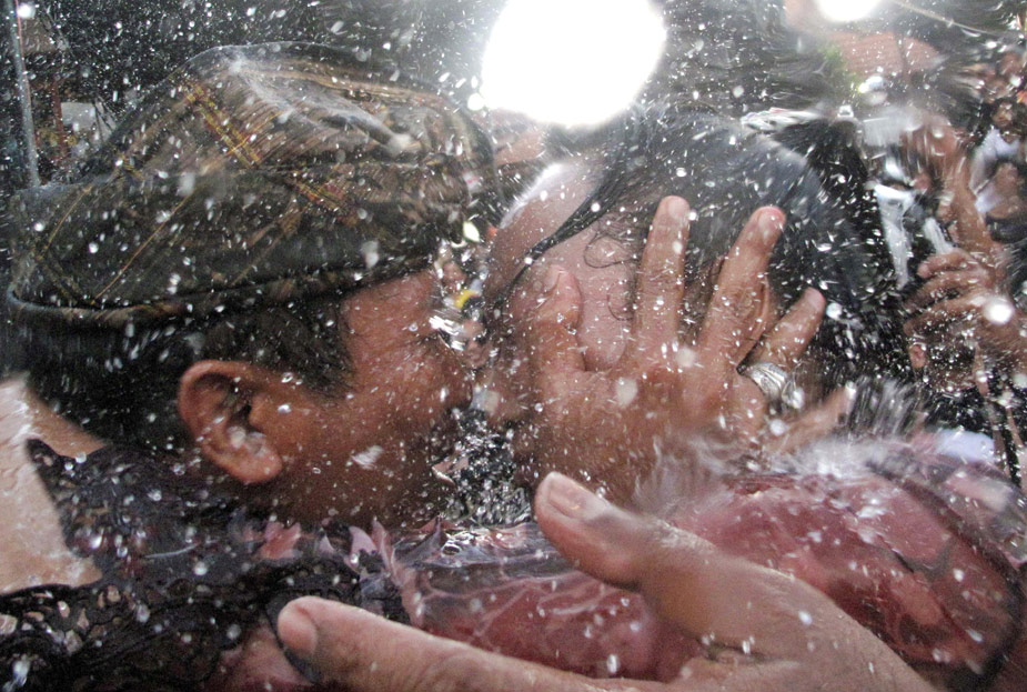 當(dāng)?shù)貢r(shí)間3月17日,印尼旅游勝地巴厘島舉行了傳統(tǒng)的“接吻節(jié)”。圖片來源:中國(guó)新聞網(wǎng)