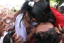 如果不說(shuō)話,她能滿足所有男人對(duì)女人最原始的憧憬——巴掌大的小瓜子臉上,濃密的齊劉海和流利的黑眼線共同強(qiáng)調(diào)出一對(duì)碩大的眼睛,眼珠在小扇子一樣撲閃撲閃的睫毛下面望著你,無(wú)辜得像一個(gè)剛從造物主手中問(wèn)世的SD娃娃。這不是全部,還有更震撼的信息等著再給你的心一記重擂——在精致妝容下根本看不出實(shí)際年齡的臉,加上65E的胸圍,再配上一尺六寸的小腰,哪怕同是女人,光想一想這不切實(shí)際的場(chǎng)景也足以胸悶到內(nèi)傷。