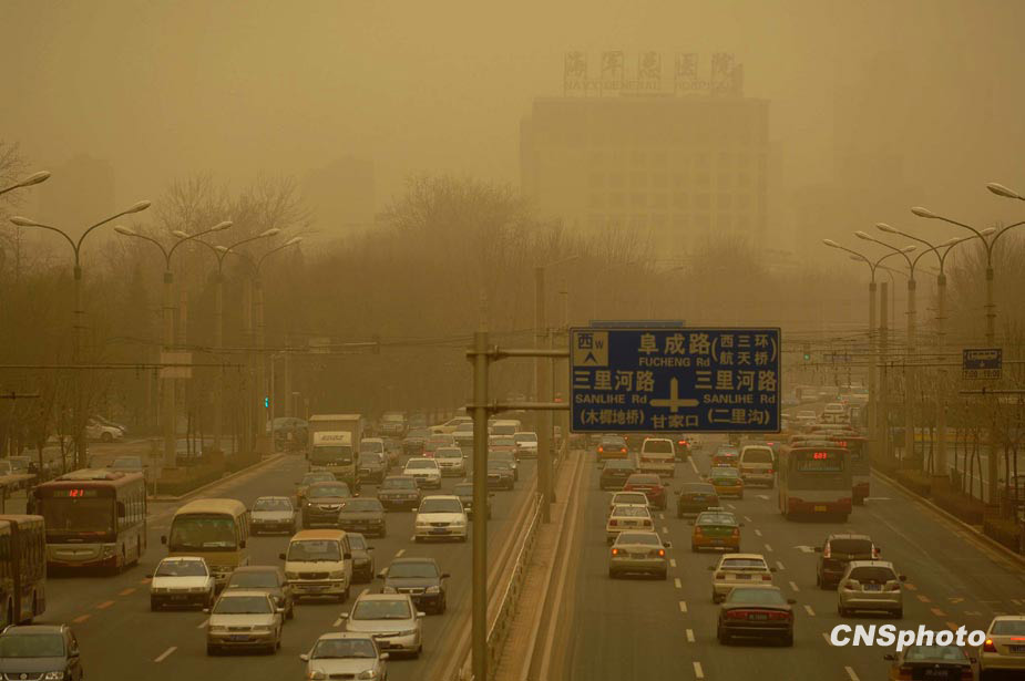 3月20日,春季首場重度浮塵天遮蓋了整個北京城。圖為北京馬路上空浮塵嚴(yán)重,帶來交通不便。中新社發(fā) 鄒憲 攝