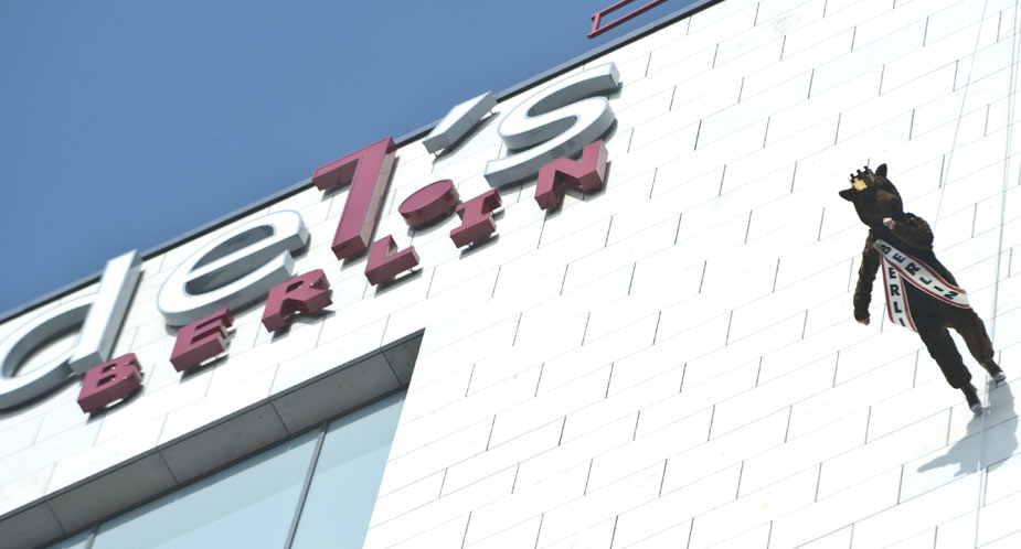 3月18日,在德國柏林舉行的“高樓漫步”活動中,一名女子打扮成熊的模樣(柏林的象征)在天使酒店外墻上行走,參加活動的人都有繩索保護(hù)。