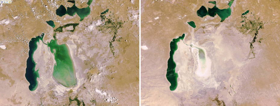 2009年7月10日歐洲航天局公布的照片顯示了號稱世界第四大內(nèi)陸水體的咸海從06年至09年海岸線急劇回落的過程。咸海的消失其實是人類無度開發(fā)利用水資源行為的惡果。