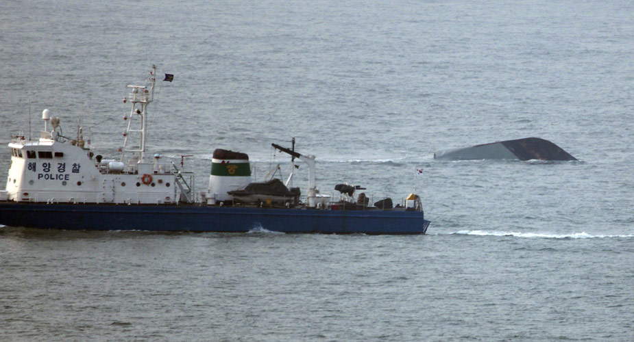 首爾當(dāng)?shù)貢r(shí)間26日晚9點(diǎn)45分許,在韓國(guó)西部海域執(zhí)行警戒任務(wù)的天安艦(1200噸級(jí))因不明原因事故,船底被炸開洞,船尾開始下沉。天安艦上共有104人,韓國(guó)巡邏艇和直升飛機(jī)迅速展開救援行動(dòng),事發(fā)5小時(shí)后,官員稱已救出58人,但因?yàn)閺?qiáng)風(fēng)和夜幕,救援行動(dòng)進(jìn)展緩慢,其它人員仍下落不明。圖為一艘救援船靠近幾近沉沒的韓國(guó)海軍“天安艦”。