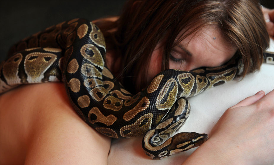 當(dāng)?shù)貢r(shí)間26日,英國(guó)一名來(lái)自于“切辛頓冒險(xiǎn)世界”的女員工為了宣傳位于萊瑟黑德的一家主題公園,擺出姿勢(shì)接受兩條黃蟒的“按摩”。圖片來(lái)源:中國(guó)新聞網(wǎng)