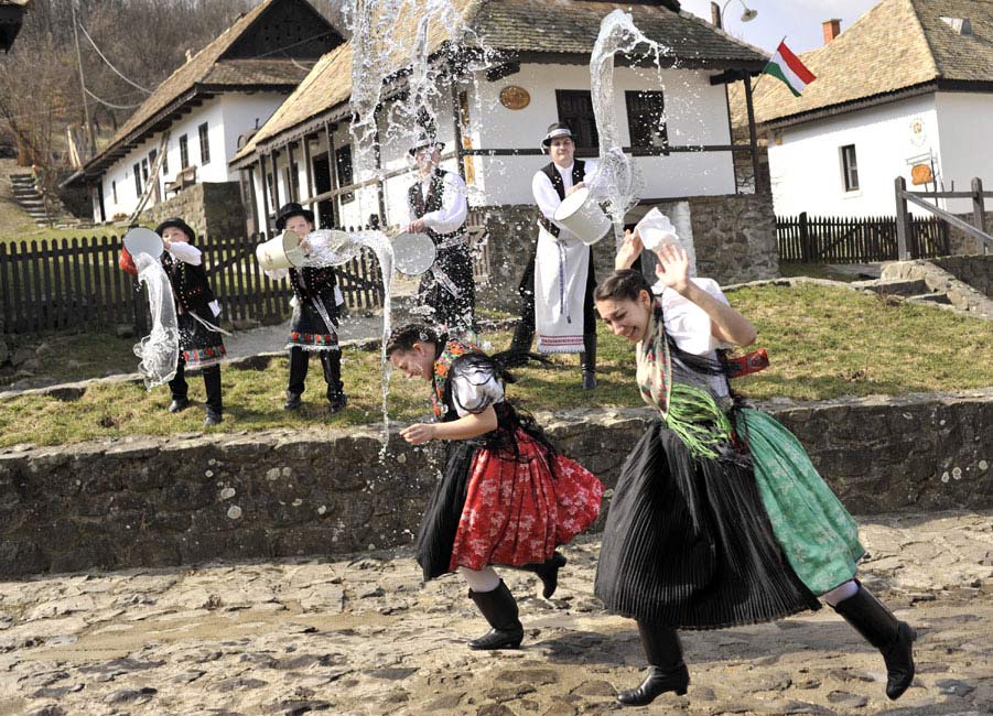 3月26日,在匈牙利首都布達佩斯以東被譽為世界文化遺產的霍洛克村,當地居民以向姑娘身上潑水的傳統儀式慶祝復活節(jié)。此項古老習俗起源于公元2世紀。