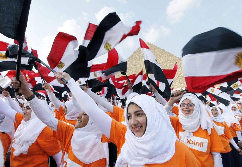 3月26日,4550名埃及兒童在首都開羅市郊的胡夫金字塔前揮舞埃及國旗,創(chuàng)造了在同一地點(diǎn)集體揮舞國旗的吉尼斯世界紀(jì)錄。
