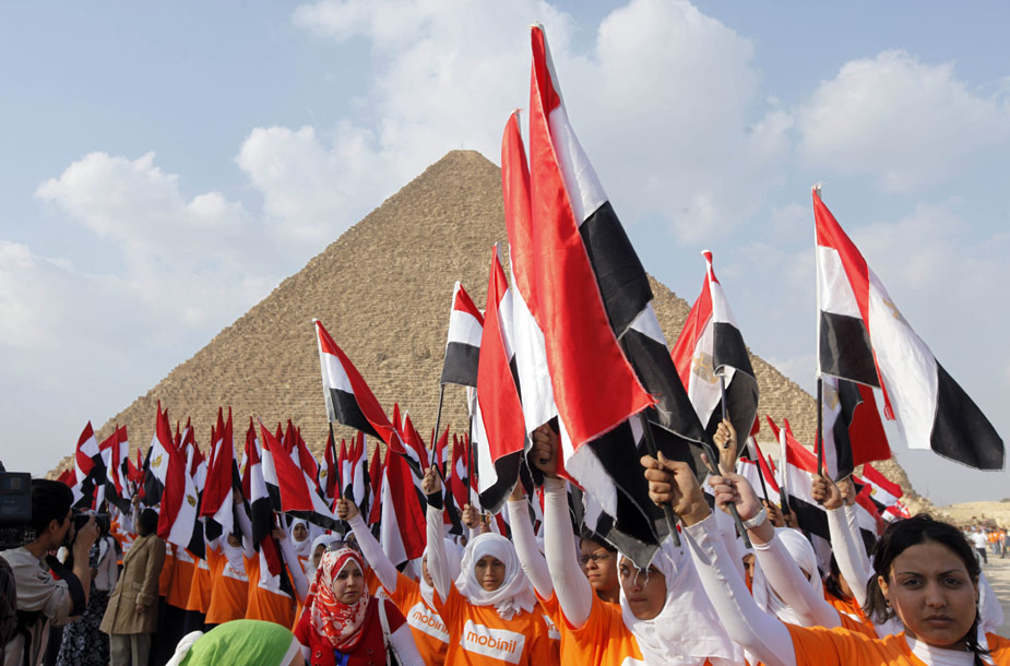 3月26日,4550名埃及兒童在首都開羅市郊的胡夫金字塔前揮舞埃及國(guó)旗,創(chuàng)造了在同一地點(diǎn)集體揮舞國(guó)旗的吉尼斯世界紀(jì)錄。