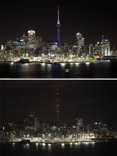 由世界自然基金會(huì)發(fā)起的“地球一小時(shí)”環(huán);顒(dòng)27日20點(diǎn)30分按照時(shí)區(qū)依次在全球數(shù)千個(gè)城市展開(kāi)。圖為新西蘭天空塔在熄燈前和熄燈后的景色。