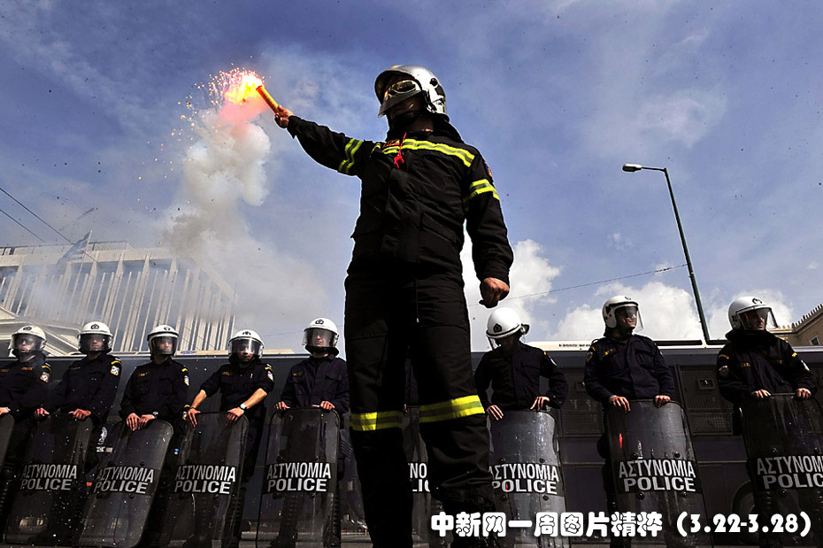 3月23日,在希臘雅典,警察封鎖了希臘國會的入口,一名抗議示威的消防隊員在一旁點燃了手中的燃燒棒。希臘政府表示,希望能在即將召開的歐盟首腦峰會上解決希臘的債務問題。