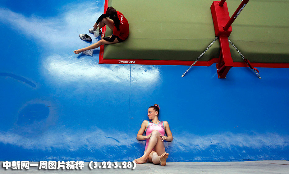 3月24日,阿根廷運動員佩雷拉在比賽間隙靠墻拉伸雙腿。