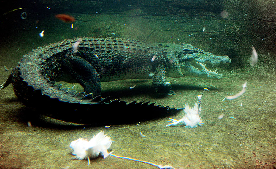 3月29日,澳大利亞悉尼野生動物園的一條鱷魚雷克斯正在享受它的美味——雞肉。圖片來源:中國新聞網(wǎng)