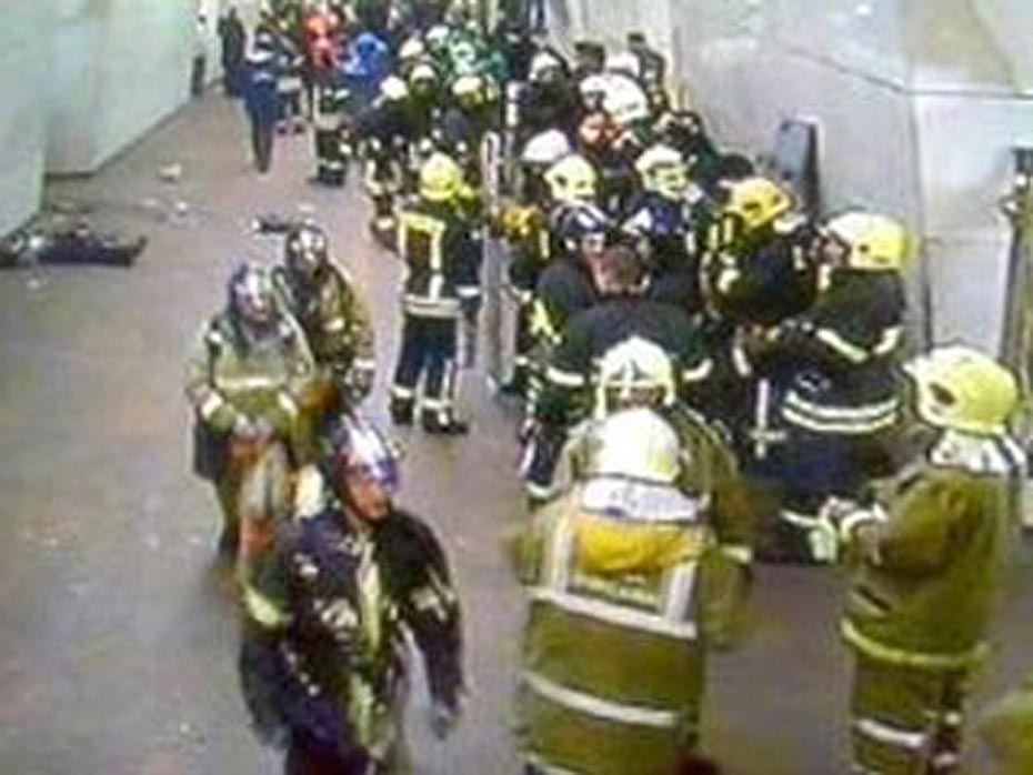 圖為發(fā)生爆炸事件的地鐵監(jiān)視器所拍攝的救援人員正在準備進入爆炸現(xiàn)場。