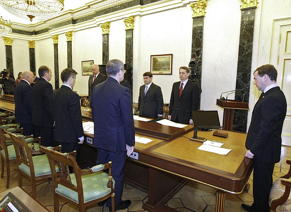 圖為俄羅斯總統(tǒng)梅德韋杰夫在召開會議前為爆炸遇難者默哀。