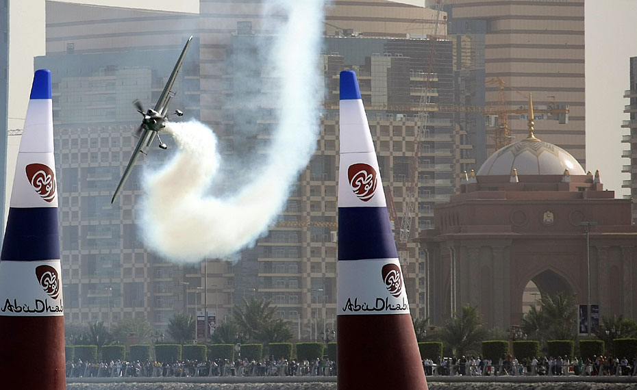 近日,紅牛飛行系列賽世界錦標(biāo)賽預(yù)選賽在阿拉伯聯(lián)合酋長(zhǎng)國(guó)阿布扎比舉行。參加比賽飛行員不但要有高速的駕駛技術(shù),還要有勇往直前的膽量。圖片來(lái)源:中國(guó)新聞網(wǎng)