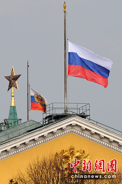 圖為俄羅斯政府機(jī)構(gòu)降半旗致哀。