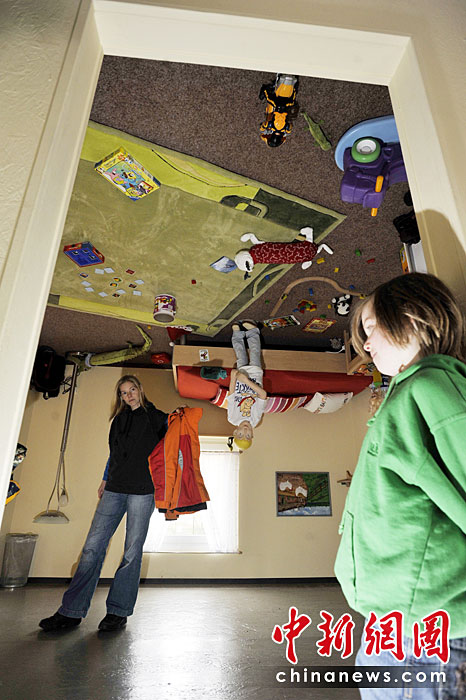 3月30日,德國蓋托夫市“瘋狂的房子”面向公眾開放。該房屋整個顛倒里面的家具也是被釘在屋頂上的。圖片來源:中國新聞網(wǎng)