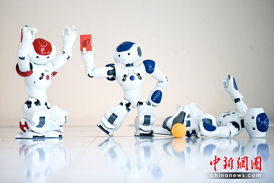 機器人足球隊在英國愛丁堡國際科學節(jié)亮相,它們由愛丁堡大學研制而成。機器人足球隊員內(nèi)置處理器可以感受周圍的環(huán)境和其他機器人的反應。圖片來源:中國新聞網(wǎng)