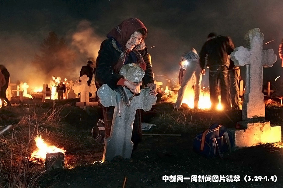 周四(1日),在羅馬尼亞弗魯穆沙尼(Frumusani)的棕枝主日(Palm Sunday)上,人們在墓地里燃起火焰,獻祭食物來悼念他們已故的親人。圖中,一位老婦倚靠在一塊十字形石碑上悼念埋藏在此的親人。