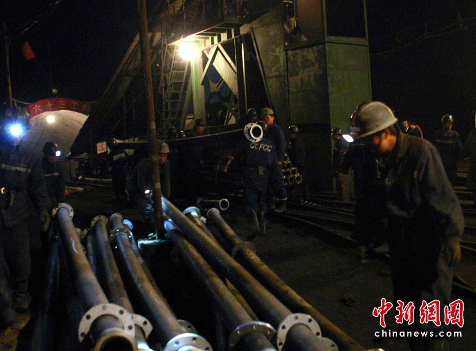 28日下午,華晉焦煤有限責(zé)任公司王家?guī)X煤礦發(fā)生透水事故。經(jīng)核查,初步確認事故發(fā)生時當(dāng)班下井261人,升井108人,有153人被困井下。圖為礦工在井下運送搶險設(shè)備。中新社發(fā) 張云 攝