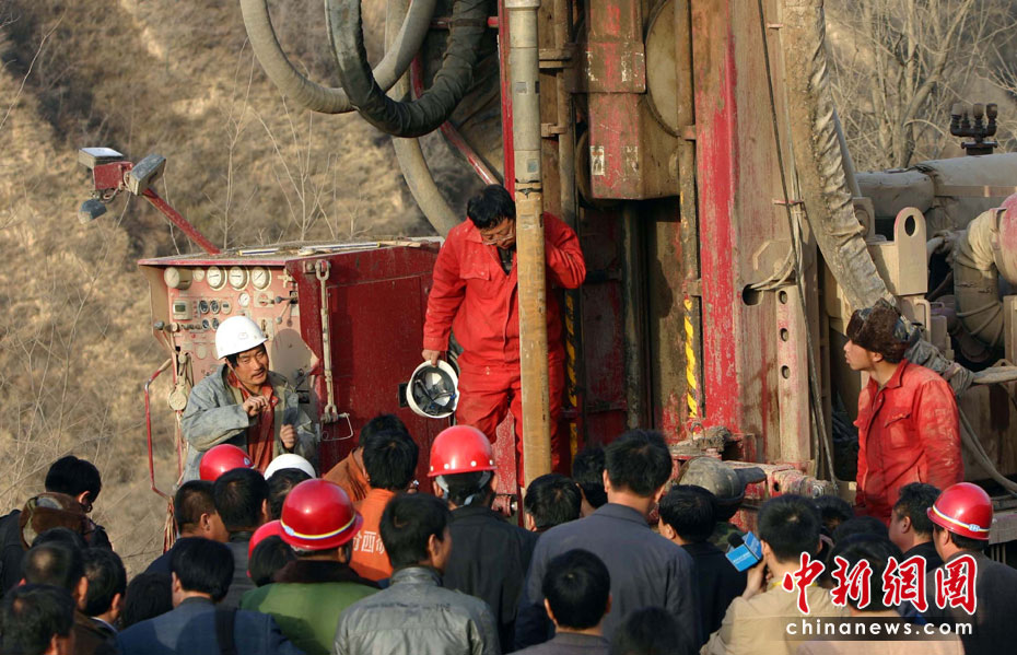 4月2日下午,華晉焦煤公司王家?guī)X礦透水事故搶險人員為井下有生命跡象的2號垂直鉆孔輸送營養(yǎng)液,并靜聽井下人員反饋回音。中新社發(fā) 張云 攝