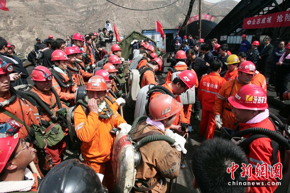 4月4日,華晉焦煤公司王家?guī)X礦透水事故第八天,搶險(xiǎn)指揮部成三個(gè)搜救小分隊(duì)下井搜救井下被困礦工,與他們一同下井還有6名潛水員。中新社發(fā) 張?jiān)?攝