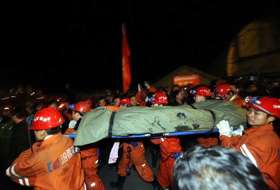 4月5日,首批獲救礦工被抬出井口。當日,華晉焦煤王家?guī)X礦“3·28”透水事故首批獲救礦工升井,被急救車送往醫(yī)院救治。目前現(xiàn)場救援工作仍在進行。圖片來源:新華網(wǎng) 燕雁 攝