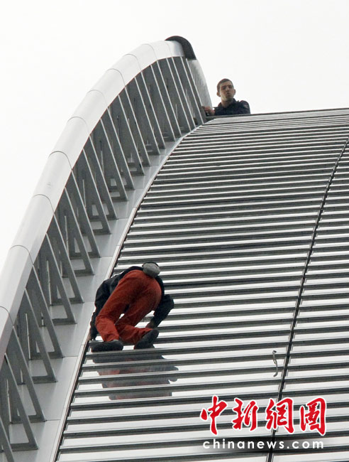 4月7日,巴黎,法國(guó)“蜘蛛人”羅伯特當(dāng)日用了大約50分鐘成功攀爬185米高的法國(guó)燃?xì)馓K伊士集團(tuán)大樓。 圖片來(lái)源:中國(guó)新聞網(wǎng)