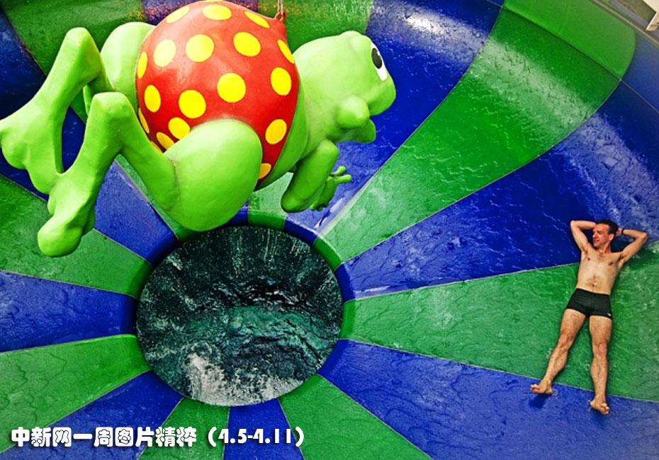 4月5日周一,在荷蘭瓦森納Duinrell游樂園中,一位游客正躺在一個(gè)名為Tikibath的泳池中享受戲水的樂趣。