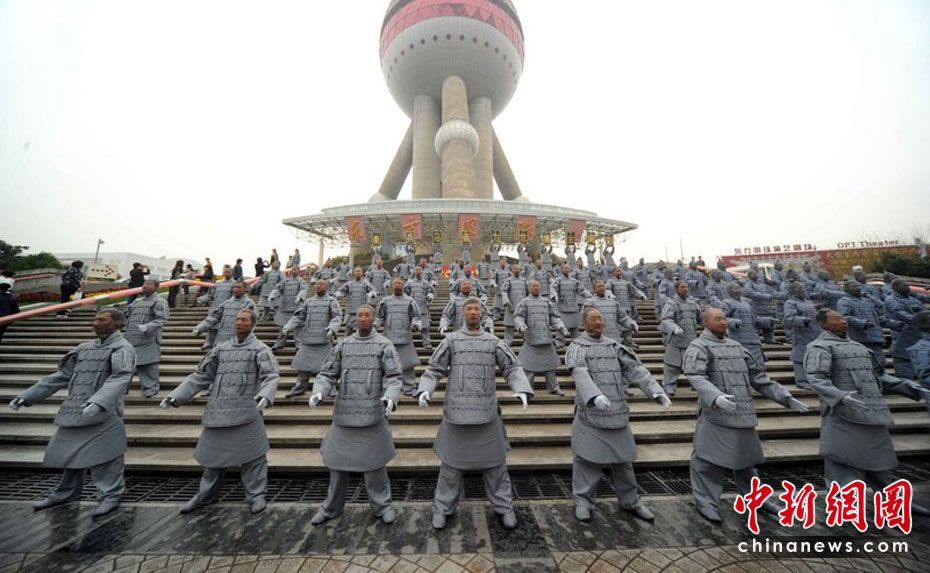 來自兵馬俑故鄉(xiāng)的百人表演隊伍,身著灰色的兵馬俑服裝,以鏗鏘的節(jié)奏、雄壯的氣勢,在上海南京東路步行街和東方明珠廣場游演。