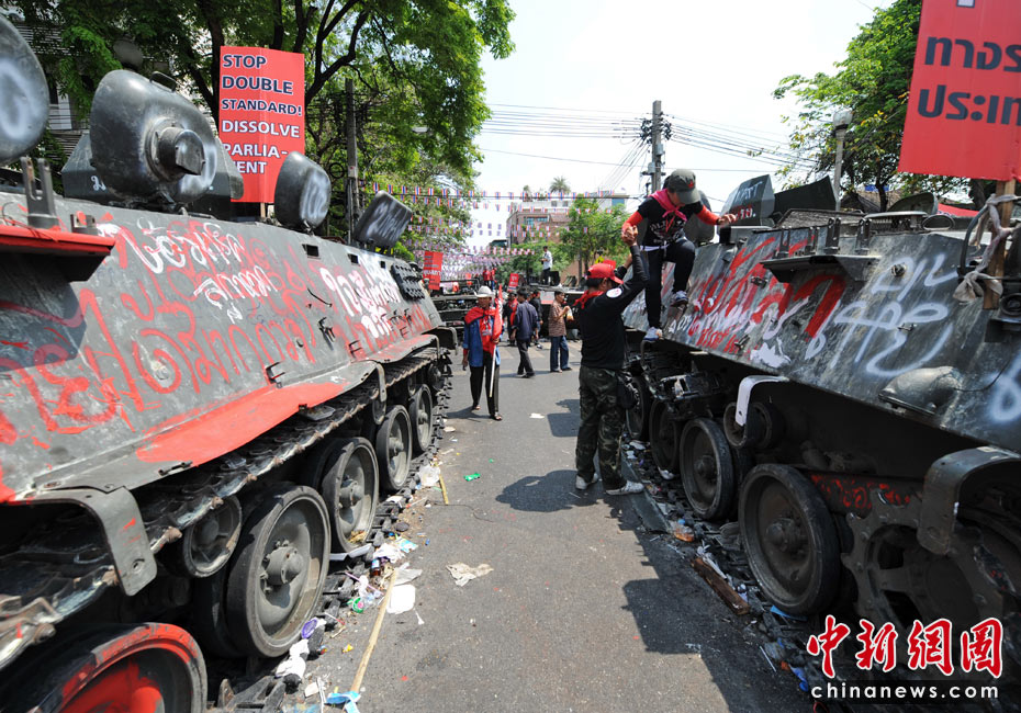當?shù)貢r間4月12日,泰國紅衫軍在曼谷市區(qū)抬著棺材舉行游行,借此向政府施壓促阿披實下臺。此前紅衫軍示威者與軍警發(fā)生沖突,造成21人死亡。圖片來源:中國新聞網(wǎng)