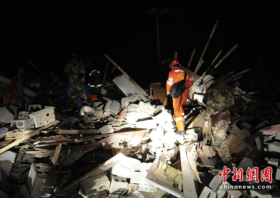 圖為4月15日凌晨1時(shí),武警玉樹州支隊(duì)?wèi)?zhàn)士和中國國際救援隊(duì)隊(duì)員一起搜救被困民眾。中新社發(fā) 廖攀 攝