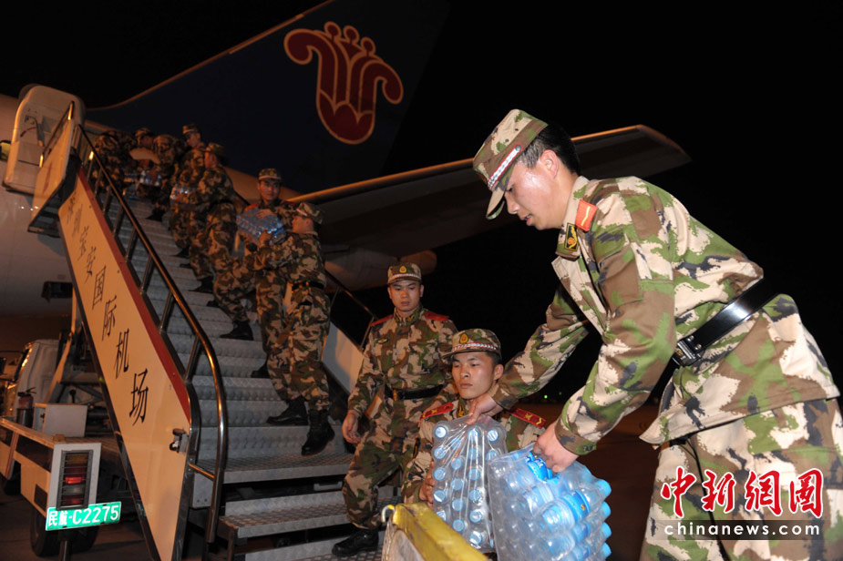 4月14日夜,廣東邊防總隊武警深圳醫(yī)院、深圳特檢站、六支隊、七支隊、邊防支隊組成的百余人醫(yī)療救援隊,攜救援物資乘南航包機趕赴青海玉樹地震災區(qū)。中新社發(fā) 陳文 攝