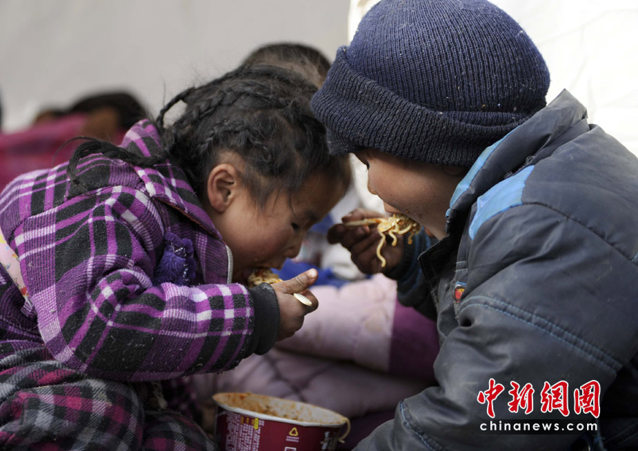 4月15日,青海玉樹縣體育場的地震災民安置點,兩名受災孩童分食一盒方便面,一根不剩。中新社發(fā) 廖攀 攝