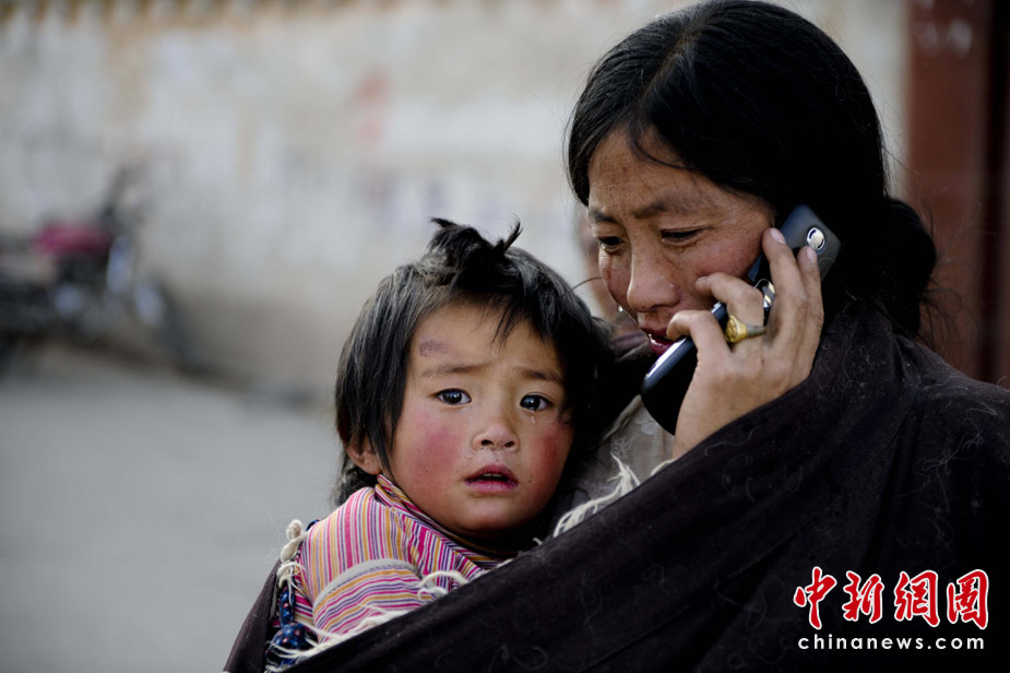 4月15日,青海玉樹縣體育場的地震災(zāi)民安置點(diǎn)內(nèi),一位母親在與親人通話時潸然淚下,懷里小女兒的腳傷還在等待醫(yī)治。中新社發(fā) 廖攀 攝