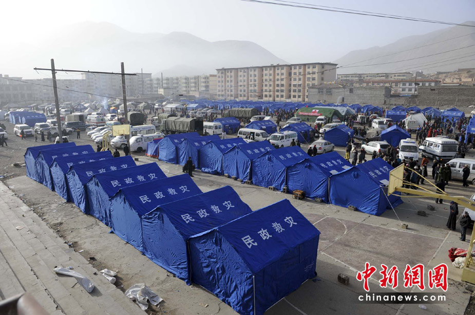 4月15日,青海玉樹縣體育場的地震災民安置點帳篷林立。目前青海省玉樹州“4·14”地震造成的死亡人數(shù)已上升至589人,10萬災民需要需要轉移安置。中新社發(fā) 廖攀 攝