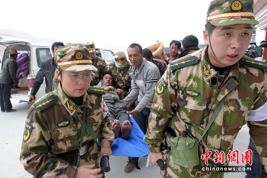 4月15日下午,云南邊防總隊醫(yī)療救援隊剛下飛機立即投入傷員轉(zhuǎn)移工作。圖為官兵們在玉樹機場從救護車上抬下地震危重傷員,進行轉(zhuǎn)移安置和治療。中新社發(fā) 陳文 攝
