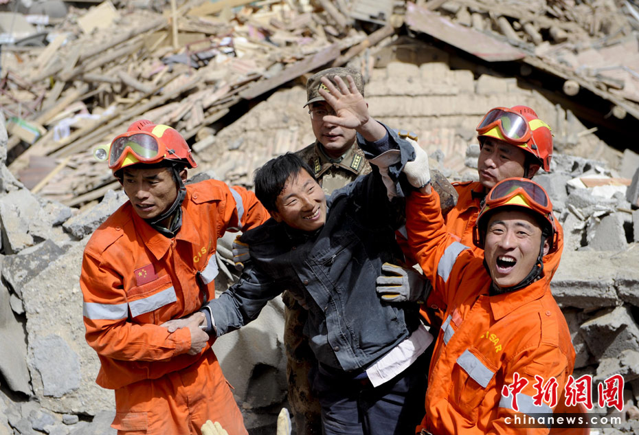 圖為4月15日12時(shí),一位幸存者被中國國際地震救援隊(duì)在青海玉樹縣結(jié)古鎮(zhèn)西北牛賓館廢墟中救出,他微笑著揮動(dòng)手臂。中新社發(fā) 廖攀 攝