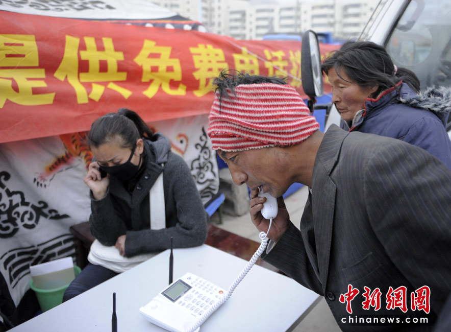 4月16日,青海玉樹體育場地震受災(zāi)民眾安置點(diǎn),民眾撥打有關(guān)部門安裝的免費(fèi)電話報(bào)平安。 中新社發(fā) 廖攀 攝