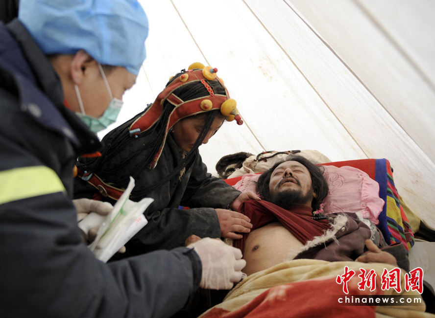 4月16日,青海玉樹體育場地震災(zāi)民安置點(diǎn),武警醫(yī)院醫(yī)療隊醫(yī)務(wù)人員來到東周丹增家的帳篷里為傷者檢查身體。中新社發(fā) 廖攀 攝