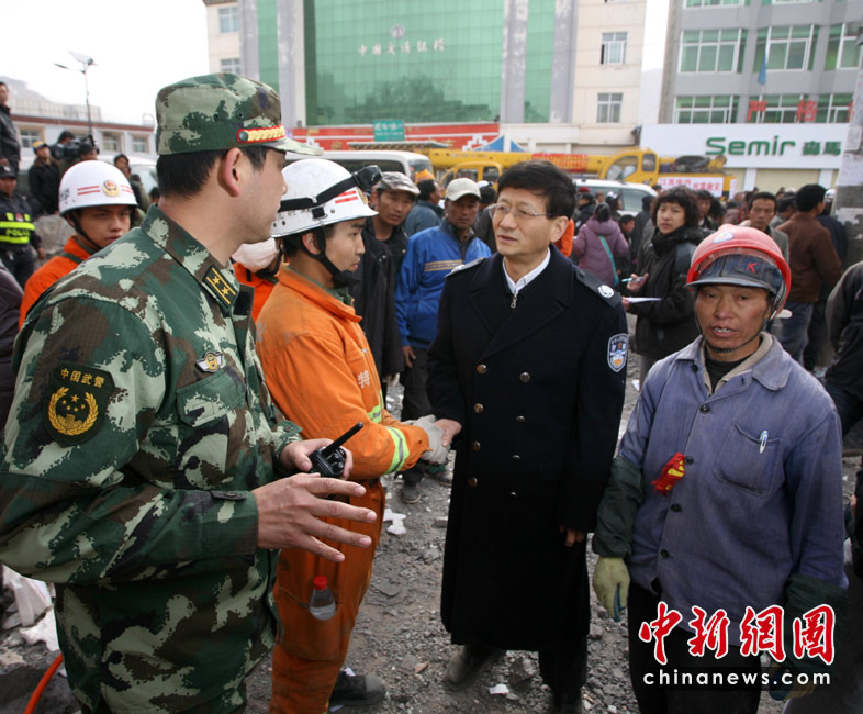 2010年4月16日10時許,國務(wù)委員、公安部部長孟建柱來到青海省玉樹藏族自治州玉樹縣地震災(zāi)區(qū)四川消防部隊玉樹教育局救援現(xiàn)場,詢問救援情況,并看望慰問消防官兵。4月14日07時49分許,青海省玉樹藏族自治州玉樹縣(北緯33.1,東經(jīng)96.7)發(fā)生7.1級地震。中新社發(fā) 劉忠俊 攝