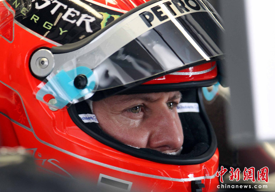 4月16日,2010國(guó)際汽聯(lián)F1世界錦標(biāo)賽上海站在上海國(guó)際賽車(chē)場(chǎng)開(kāi)始車(chē)手第一、第二次練習(xí)賽。圖為代表梅賽德斯GP車(chē)隊(duì)出戰(zhàn)的老車(chē)王、德國(guó)車(chē)手舒馬赫重回上海賽道。 中新社記者 任晨鳴 攝