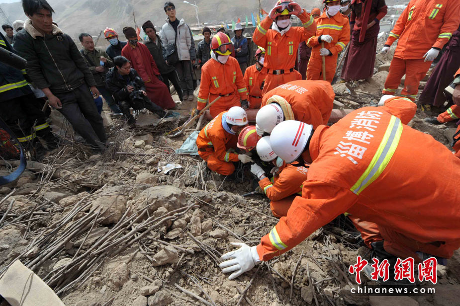 4月16日,青海玉樹(shù)地震救援進(jìn)入第三天,來(lái)自蘭州軍區(qū)、山東消防特勤、重慶特勤、廣東邊防總隊(duì)、云南邊防總隊(duì)、青海民兵等搜救隊(duì)連續(xù)搜救,幸存者奇跡生還。中新社發(fā) 陳文 攝