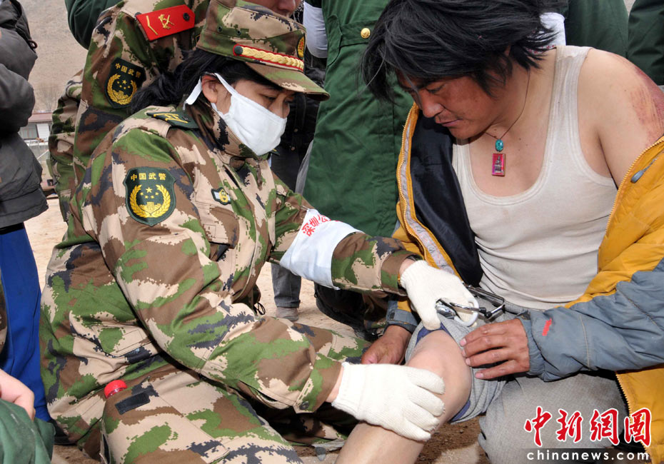 4月16日上午,廣東邊防總隊(duì)抗震救災(zāi)醫(yī)療隊(duì)在青海玉樹州結(jié)古鎮(zhèn)民族師范學(xué)院廣場設(shè)立救治點(diǎn),當(dāng)日救助地震災(zāi)區(qū)傷員200多名。中新社發(fā) 陳森陽 攝